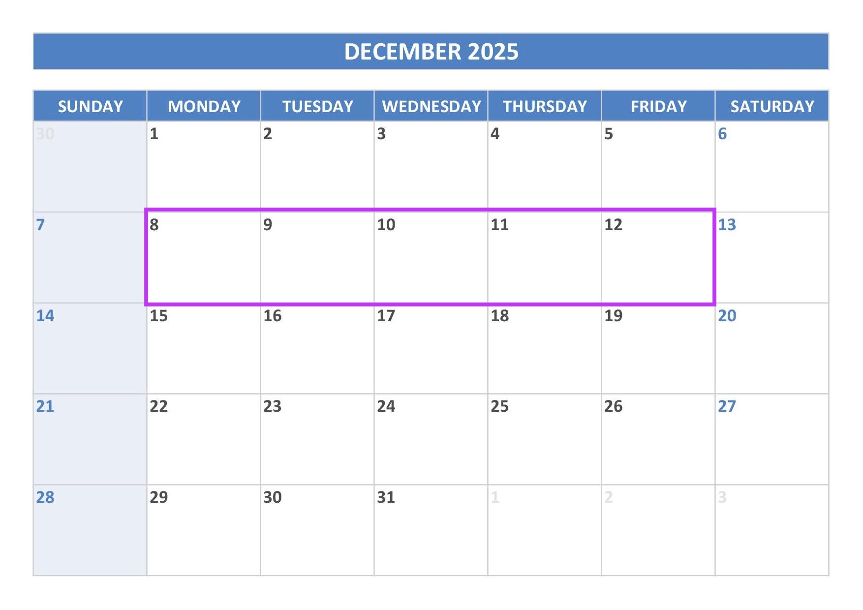 December 8 - December 12, 2025 8:00am - 5:00pm Central Time Exam is administered in person on Friday (DFW AREA)